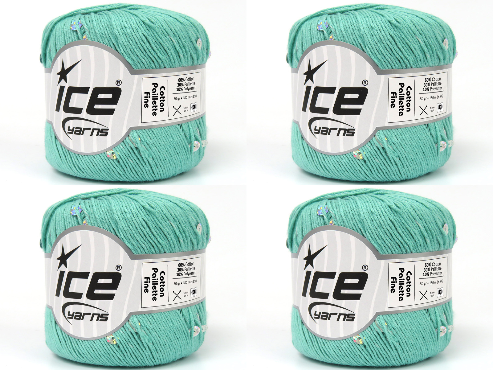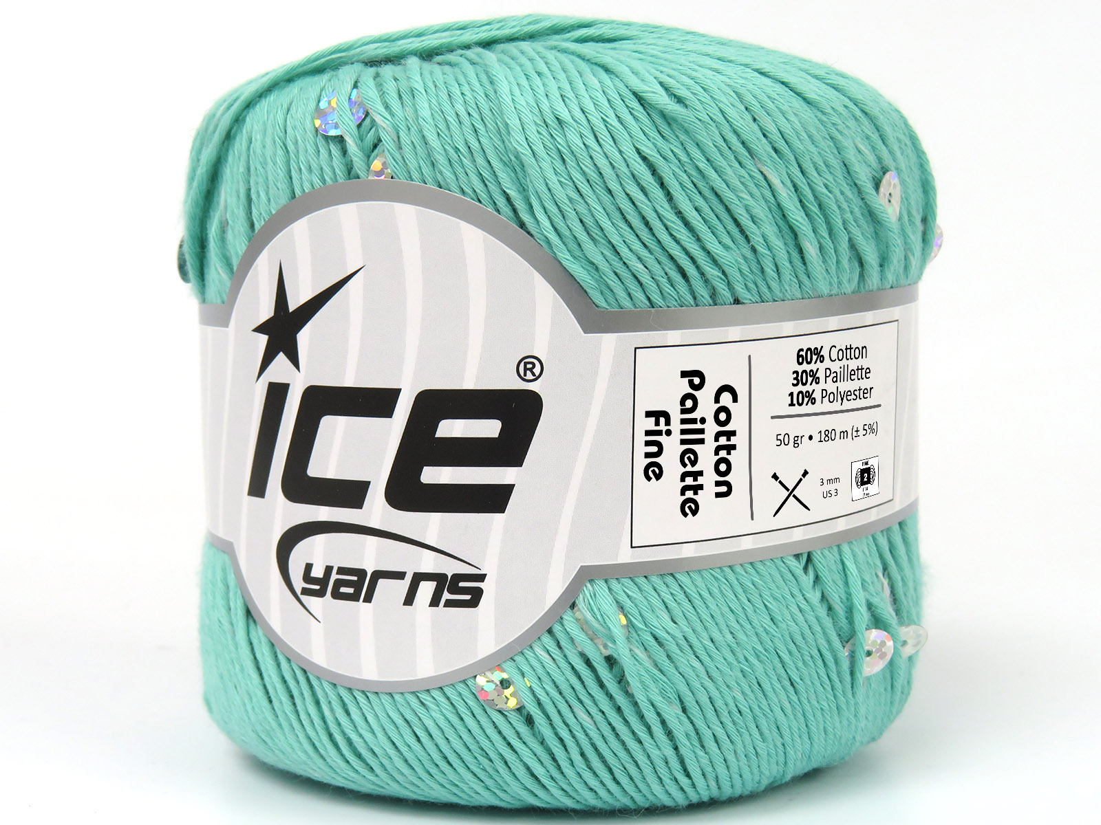 SKU:fnt2-83780 Needle Size:EU 3mm | US 3 Color:Green Brand:Ice Yarns Length:180m 197ydper ball Fiber Content:30% Paillette, 10% Polyester, 60% Cotton Weight:50gr 1.76oz per ball